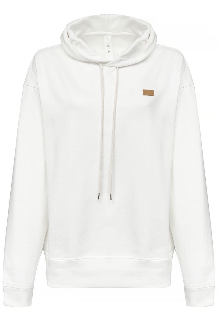 Худи из весенне-летней коллекции выполнено из натурального хлопка в белом цвете. Модель свободного кроя доработали спущенной линией плеч, большим капюшоном с завязками и небольшим патчем на груди.