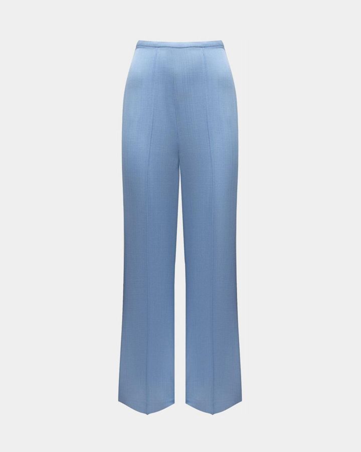 Прямые брюки с высокой талией от ROHE. Изделие выполнено из текстурной итальянской вискозы небесно-голубого цвета и имеет прорезные карманы сзади. Также внизу брючин сзади есть два небольших акцентных выреза.